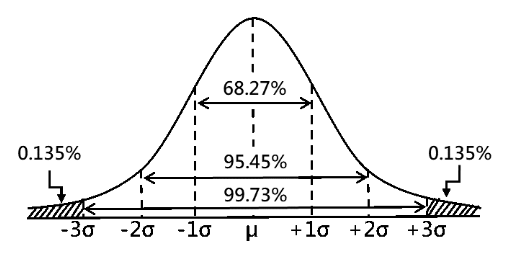 μ:母體之平均值;σ:母體之標準差,常態分佈於μ±σ之間的機率P(Probability)為: