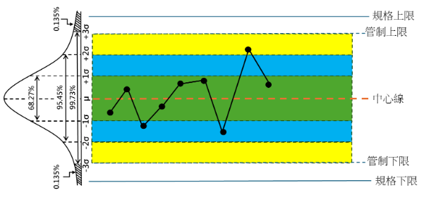 許多 SPC 工具,特別是管制圖的管制界限(通常設置在均值 ±3 個標準差位置,如圖四),其理論依據來自於常態分佈的特性。±3σ(99.73%)範圍幾乎涵蓋了所有由共同原因(Common Cause)引起的隨機變異,因此超出這個範圍點很可能意味著特殊原因(Special Cause)的出現。