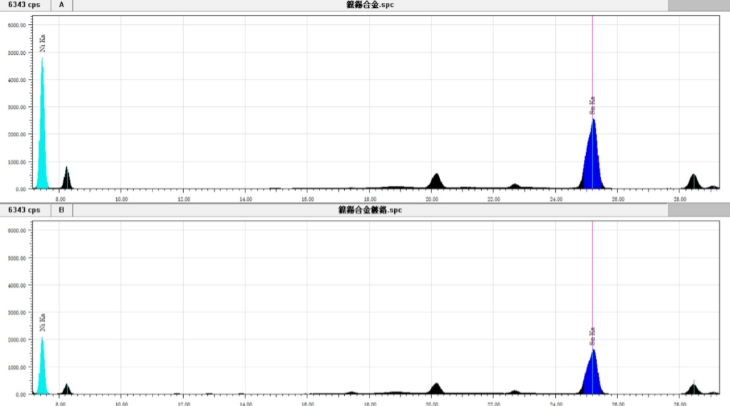 透過測試,可以得知鍍層是怎麼樣影響樣品的測量結果。除了成份分析會有異常外,也會發生鍍層部分的佔比被放得太大,導致該部分的有害物質因誤判而超標、或底材部份因訊號被鍍層遮蔽,導致該部分的有害物質濃度沒辦法被正常檢出。