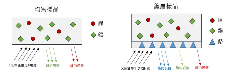 XRF 在進行成份分析及有害物質測量時,測量對象以單一均質樣品最為理想,但經過鍍層處理後,樣品變成底材與鍍層的複合結構,在測量時就會造成相應的影響,導致最終呈現的結果與樣品的實際情況有所差異。