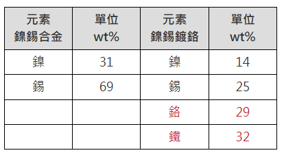 以無限厚(*註一)的鎳錫合金(鎳30%、錫70%)為底材,配合鉻鍍層標準品(含鐵,厚度為1.01μm)進行檢測(測量能譜如圖三、結果如表一)。
